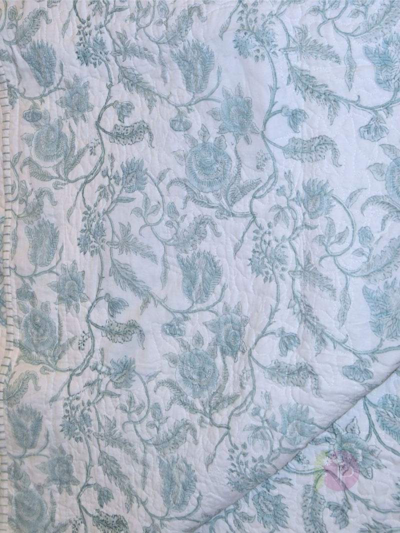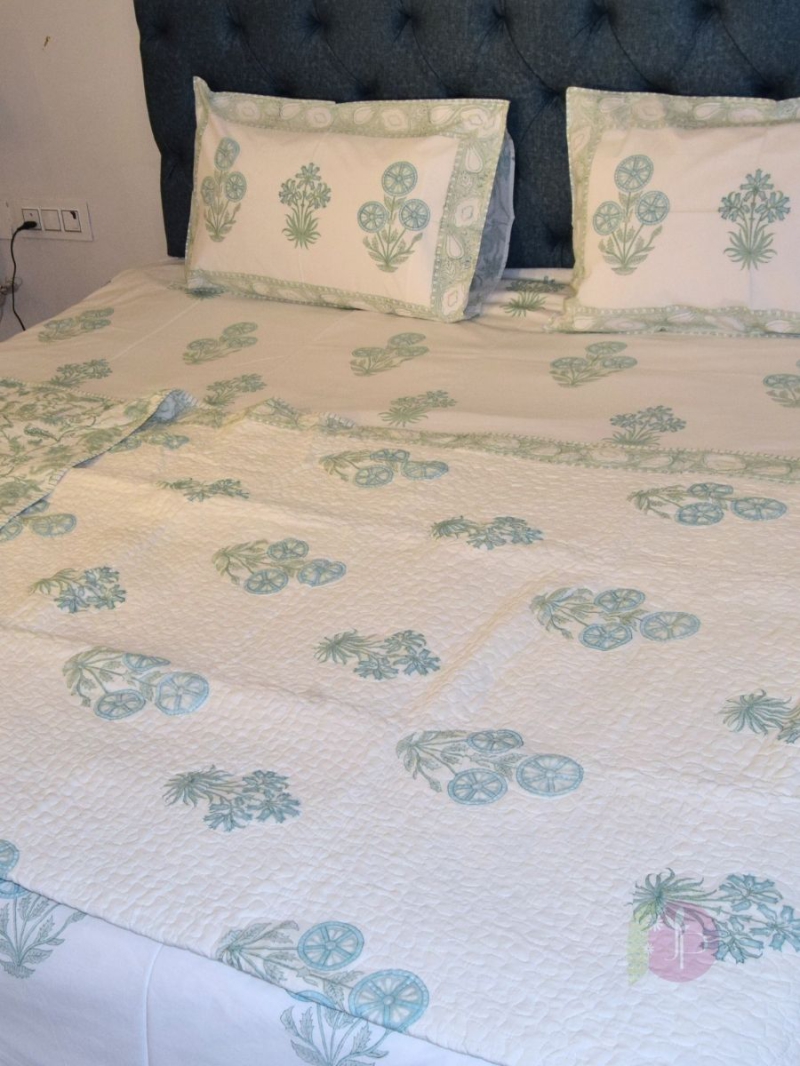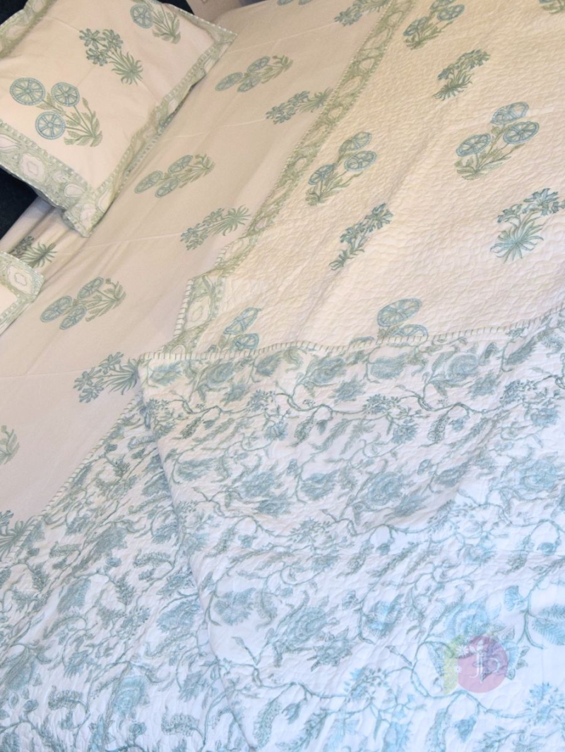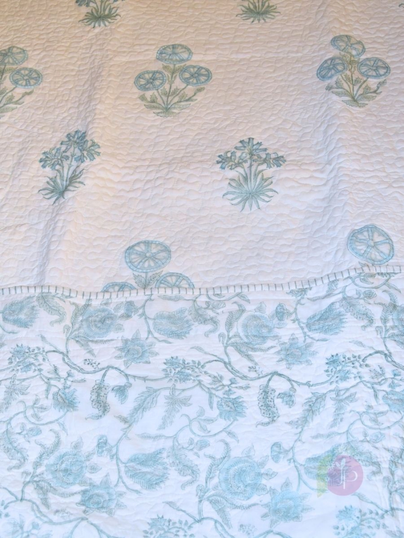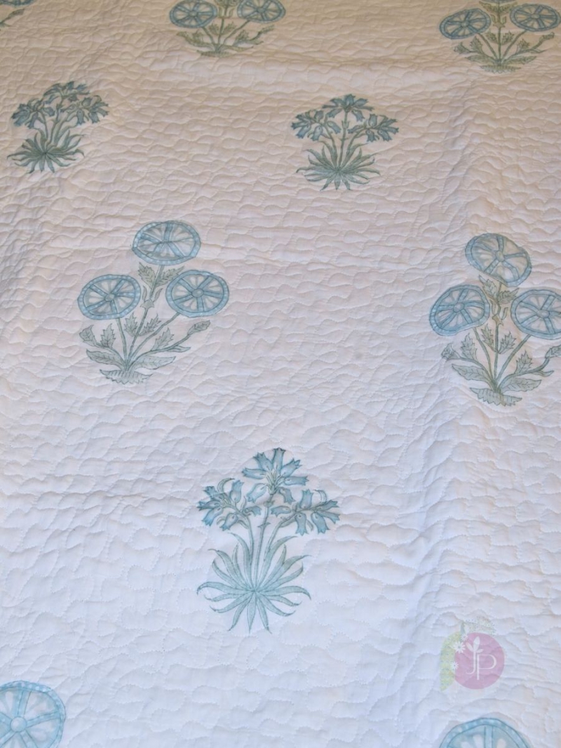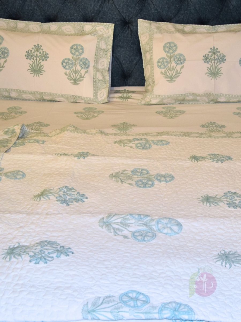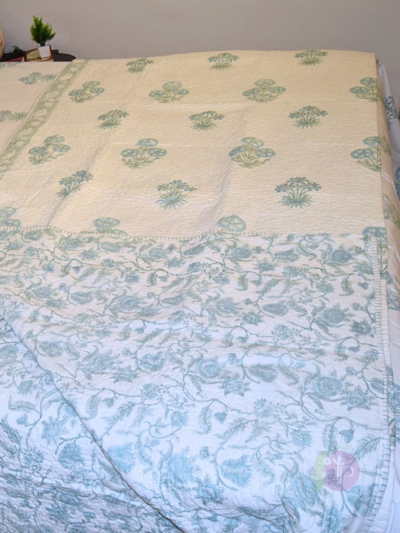 Buy Aqua Green Floral Hand Block Print Quilted King Size Cotton Bed Cover | Hand Block Print by Jaipuri Print