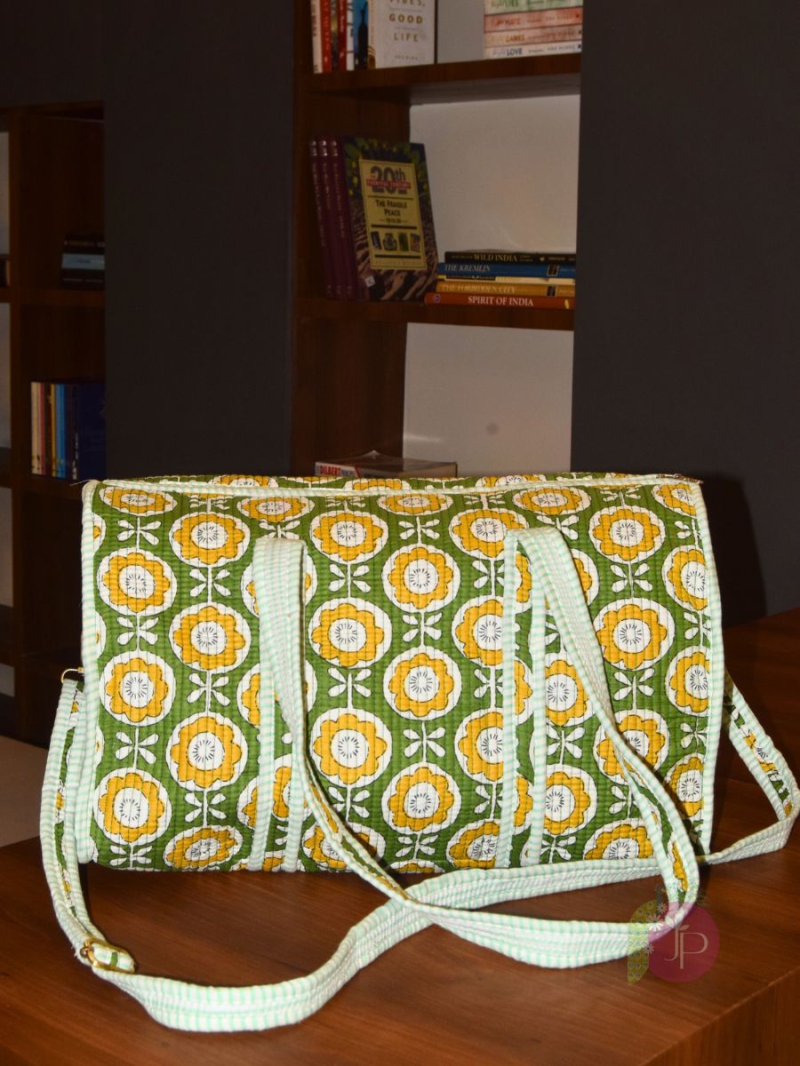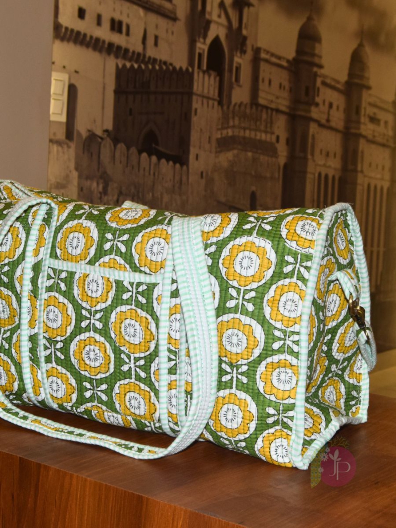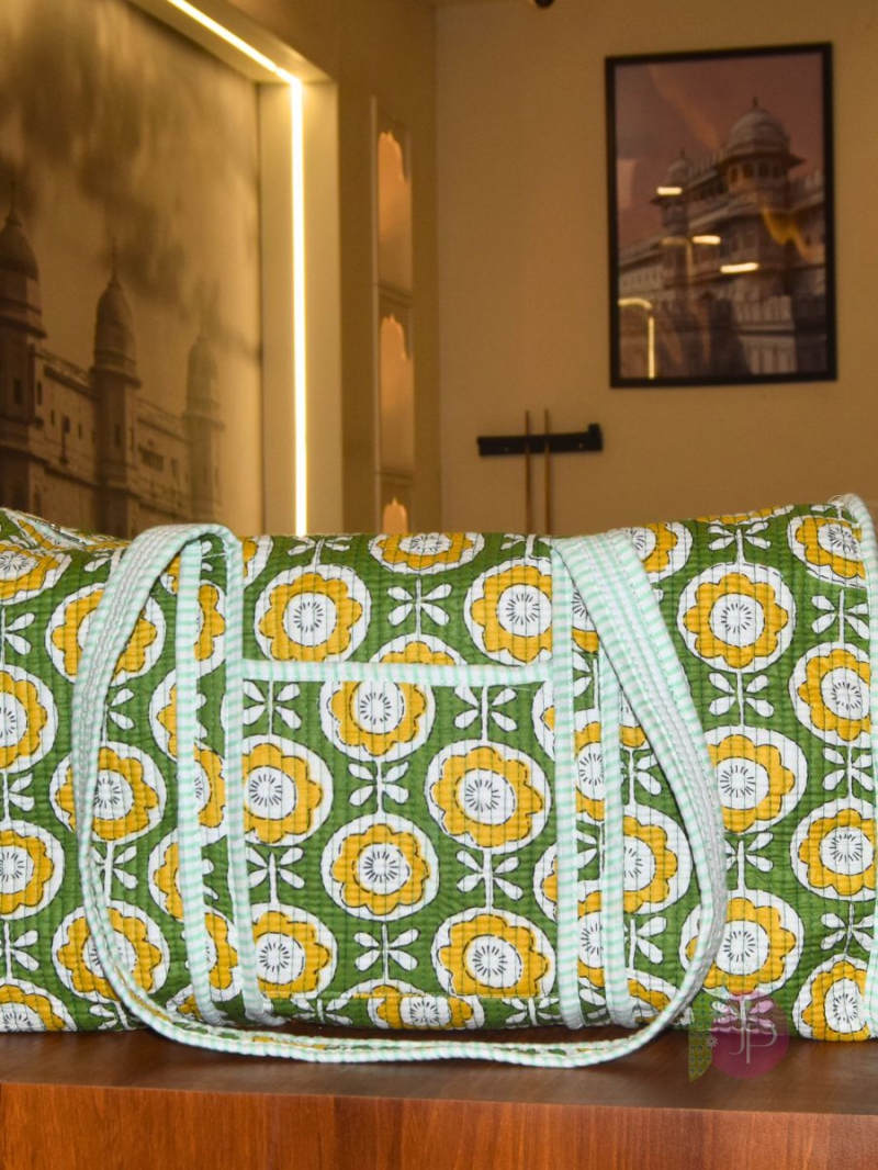 Stylish, spacious, and traditional – this weekender bag in green and yellow Jaipuri block print is a travel essential for the modern woman who loves culture and comfort.