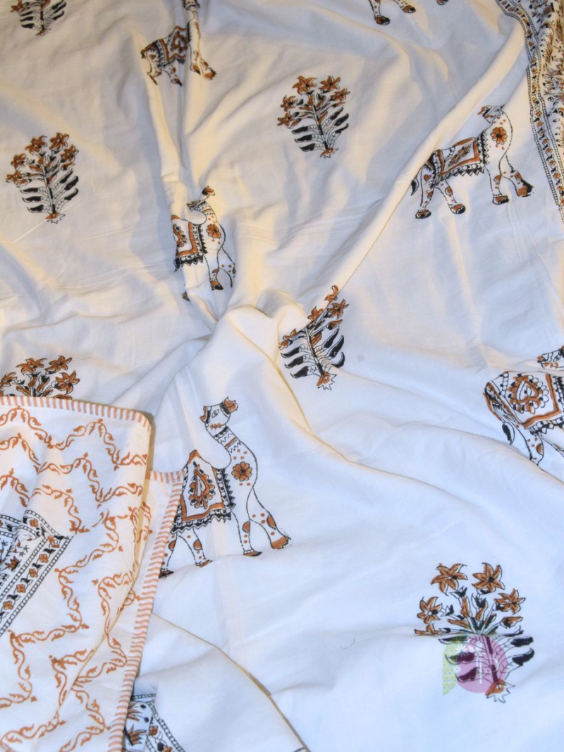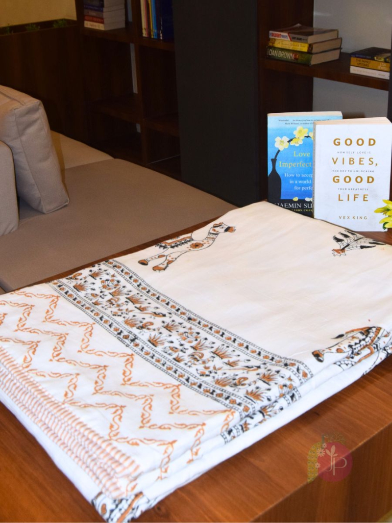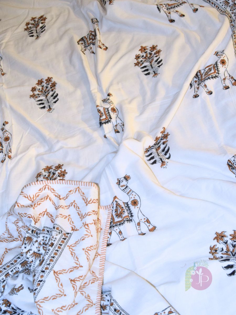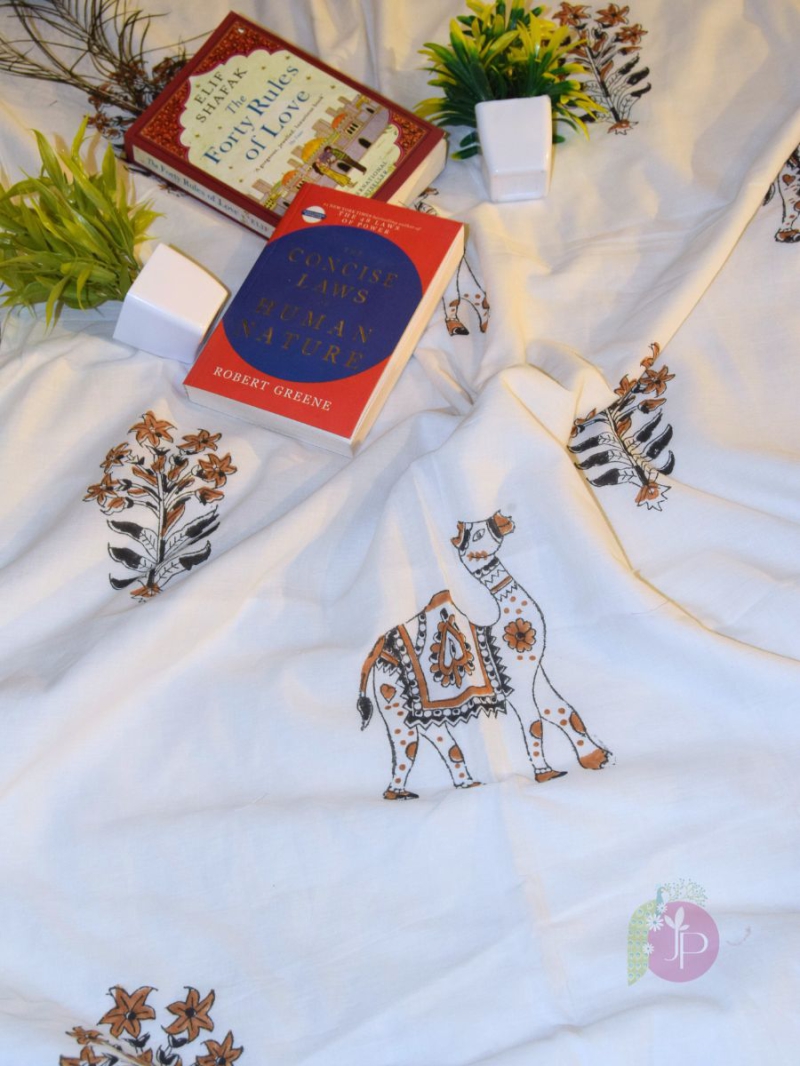 Rooted in the heart of Rajasthan, our Jaipuri Cotton Dohars are more than just blankets – they are textile art. The camel and flower motifs are symbolic of endurance and beauty. Camels represent the spirit of Rajasthan, while flowers bring a touch of grace and harmony to the fabric.