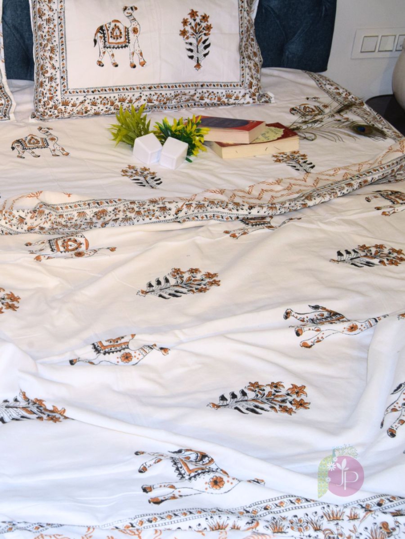 Bring home a piece of Rajasthan's heritage with our Jaipuri Premium Camel and Flower Design Cotton Dohar. Handcrafted with love in Jaipur, this AC blanket features intricate camel and floral motifs, inspired by desert life and nature’s serenity. Colored in earthy brown and classic black, it’s a versatile, all-season comforter that blends traditional elegance with contemporary utility.