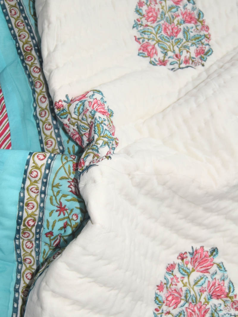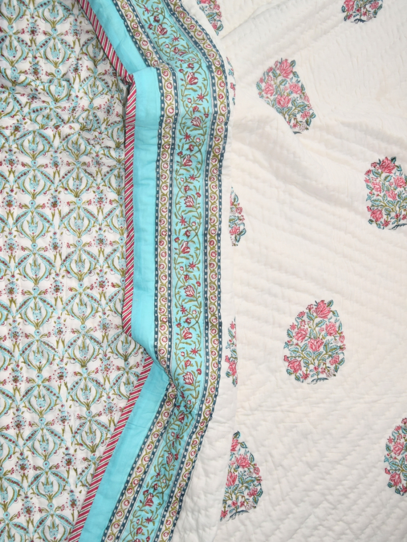 Buy Lungwort Quilt – Pink & Blue Floral Hand Block Jaipuri Cotton Razai