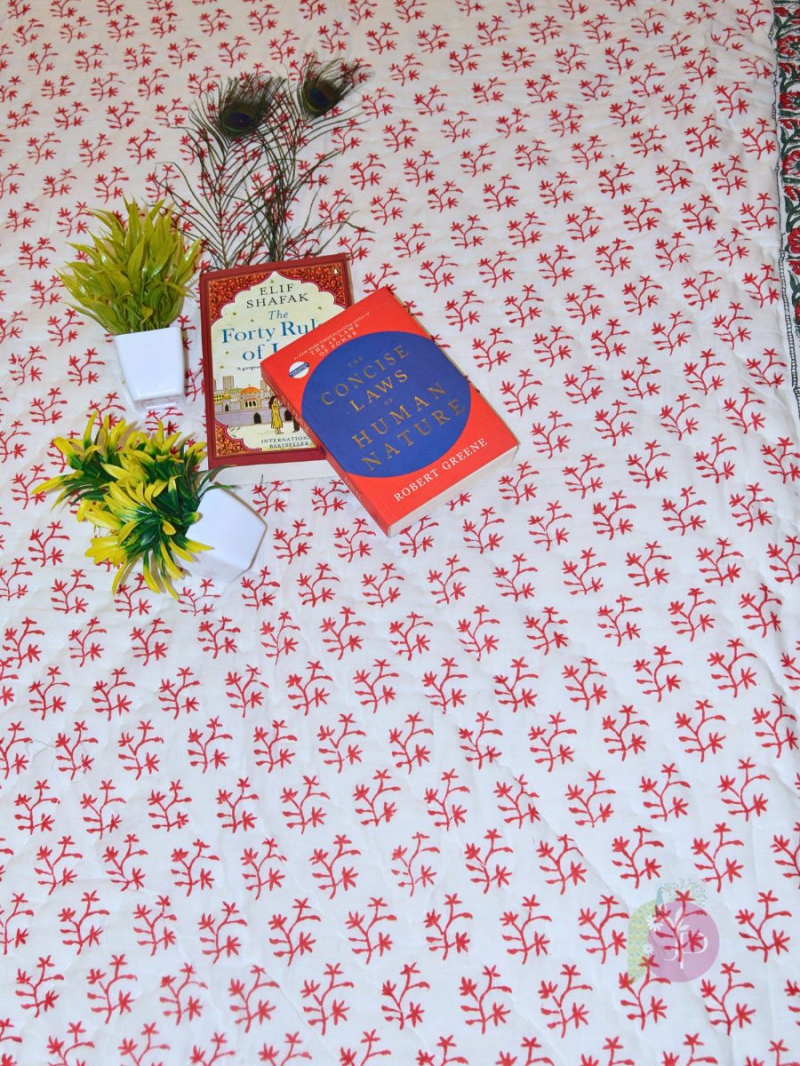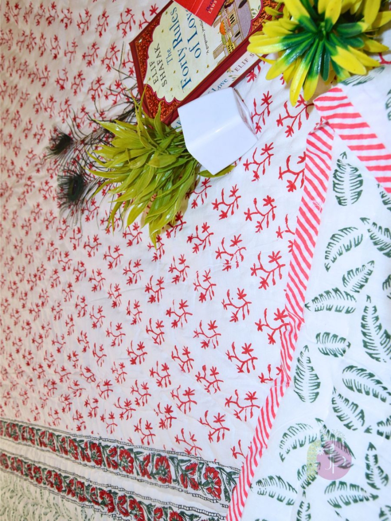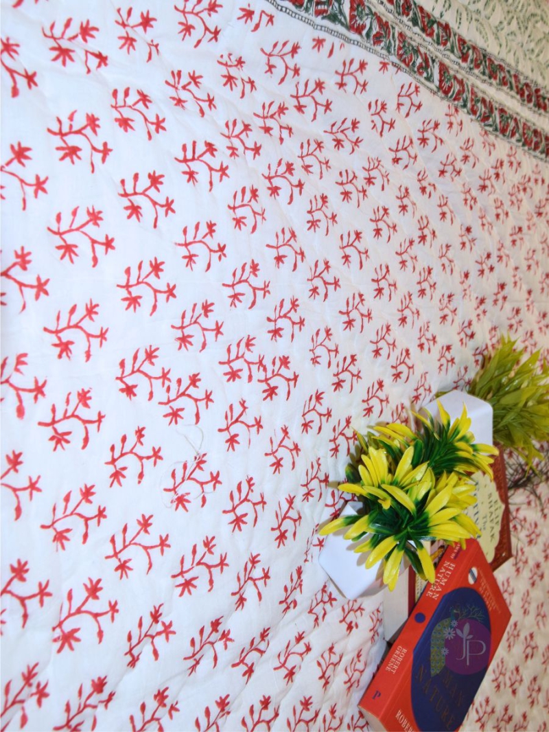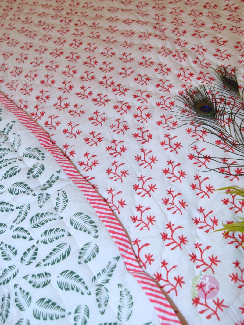 - Handcrafted Jaipuri Quilt – Red Leaf Print – Pure Cotton Razai