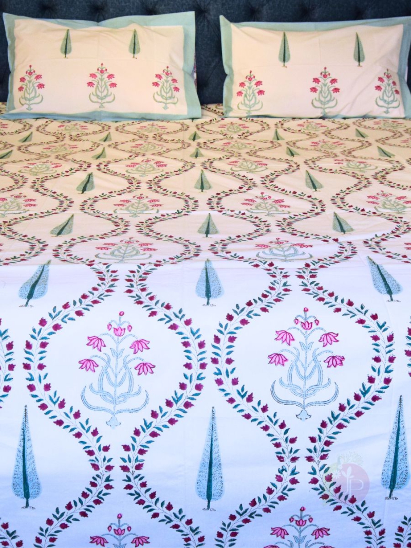 Buy Online Pink Rose and Tilak Forest Bedsheet - Elegant Hand Block Cotton Bedsheets from Jaipur