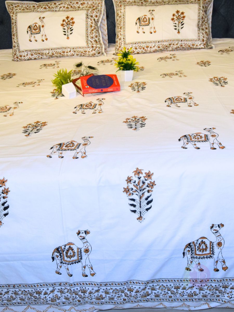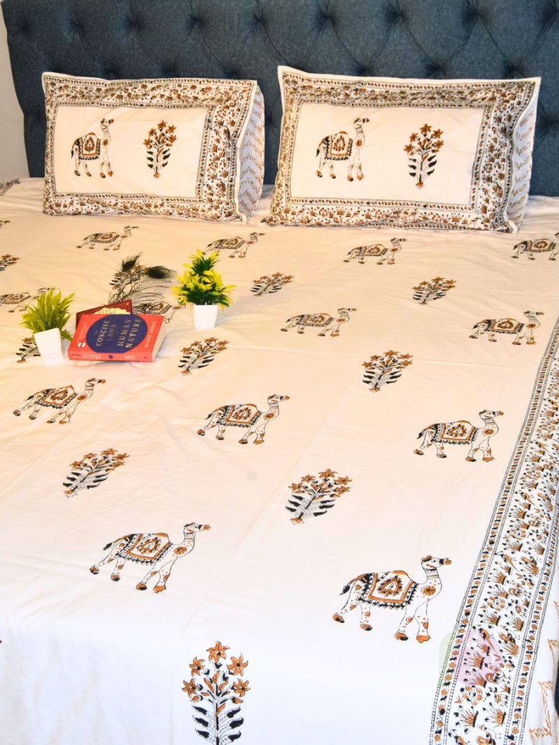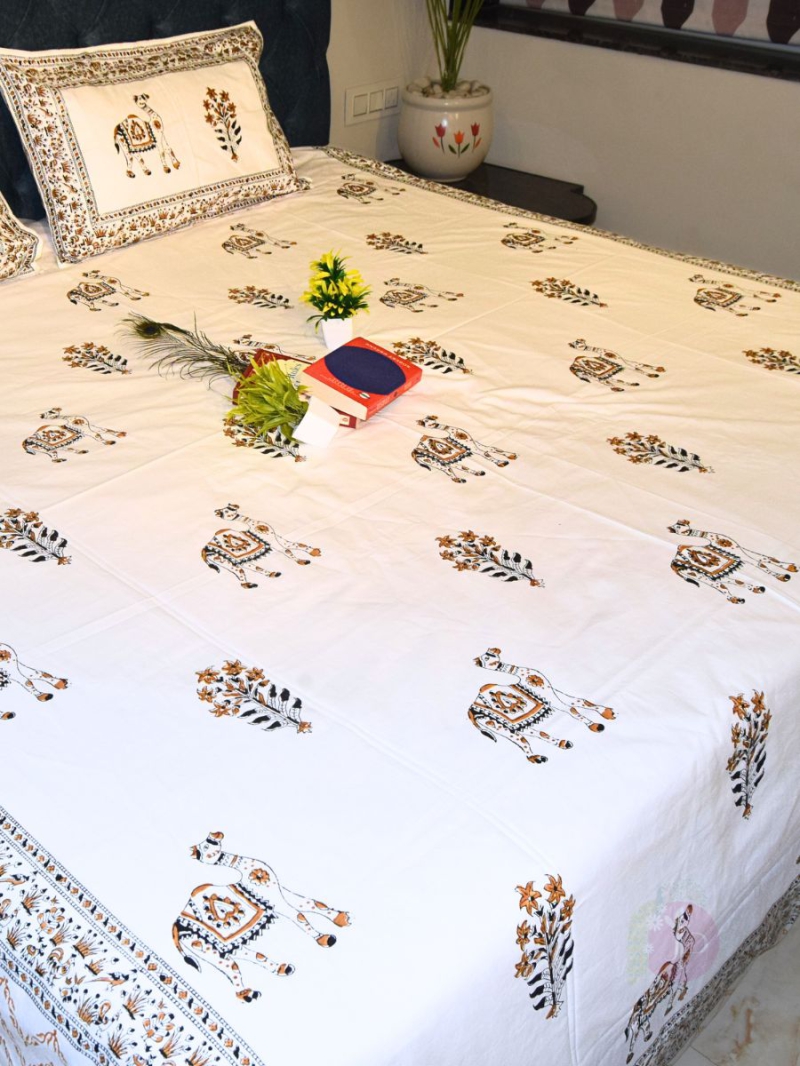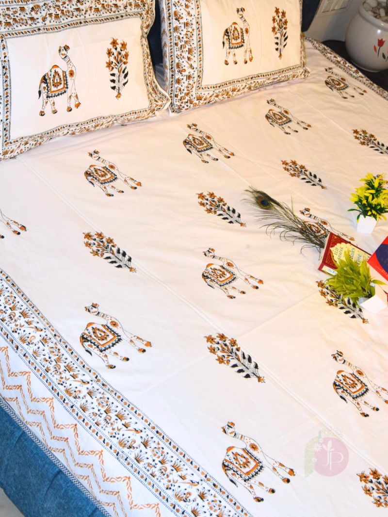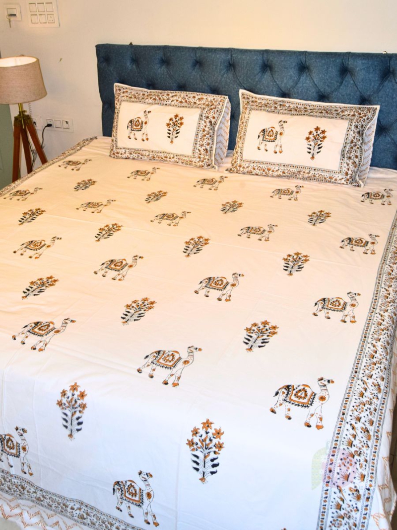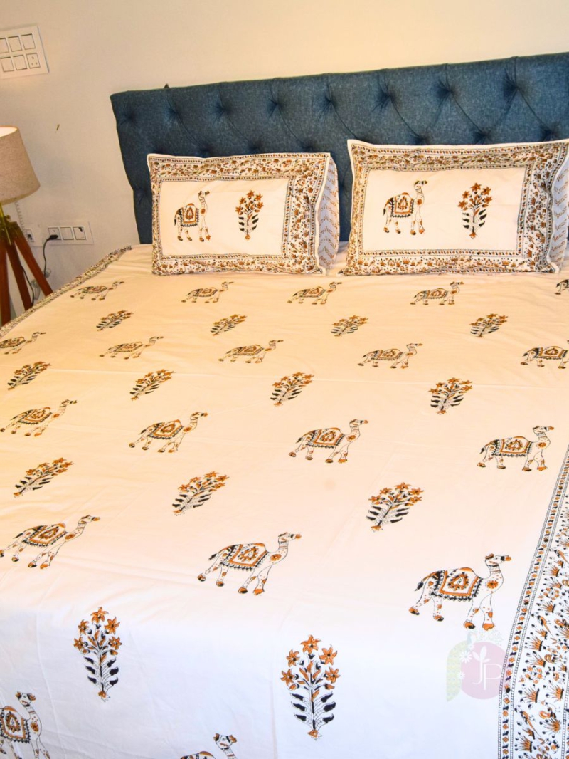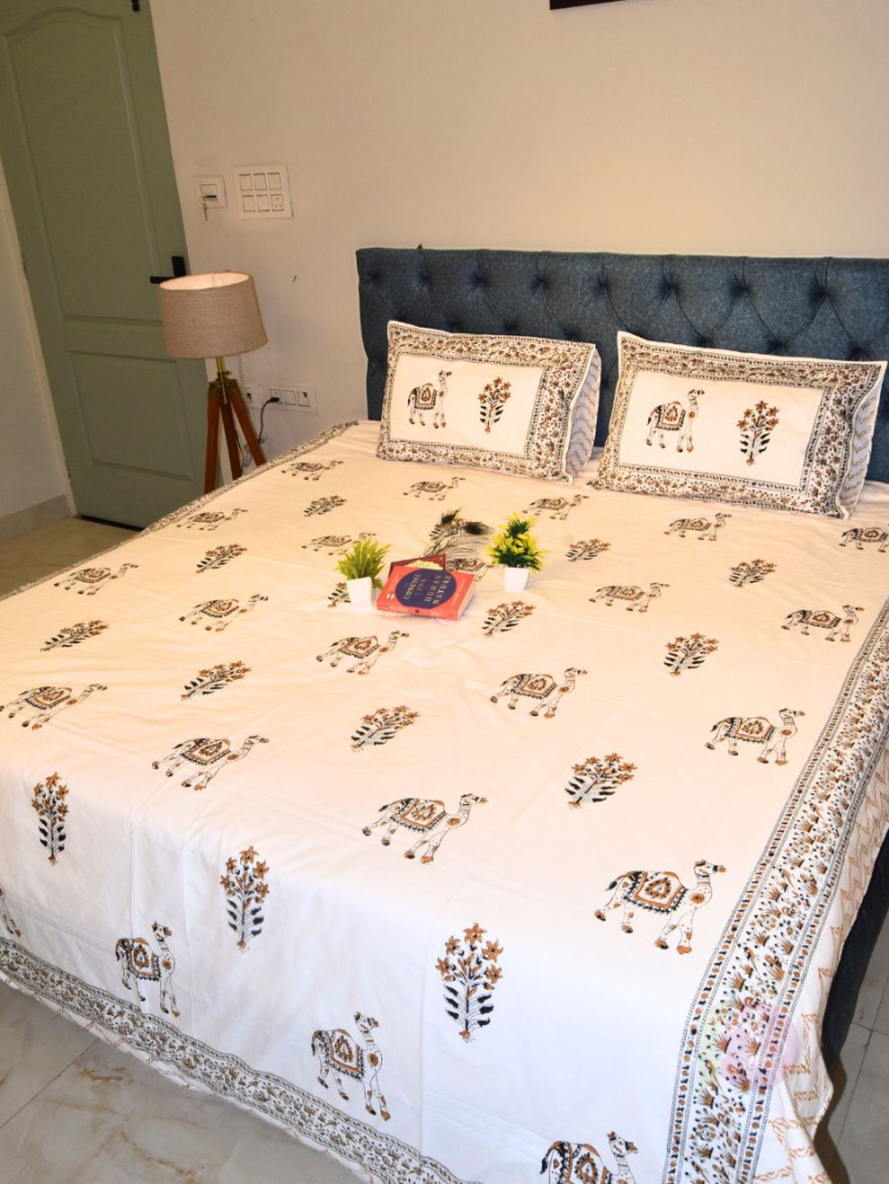 This Premium Camel Print Jaipuri Bedsheet is where heritage meets modern luxury. Drawing inspiration from traditional Rajasthani block prints, it features a beautifully detailed camel motif in earthy brown and black tones. Each piece is a celebration of India's artisanal legacy, handcrafted to perfection for the modern Indian home.