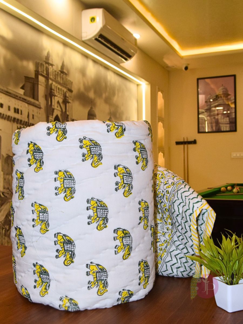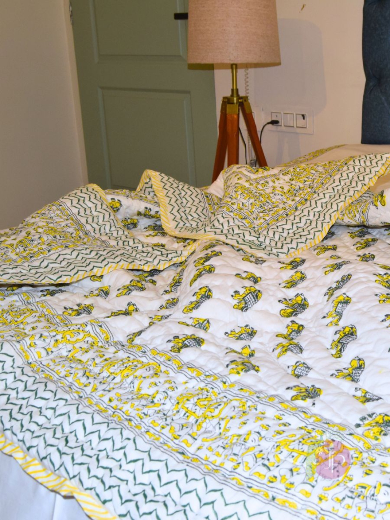 Shop 100% cotton Jaipuri quilts online with small elephant hand block print. Perfect for single and double beds. Lightweight, artisan-crafted, and breathable for all seasons.