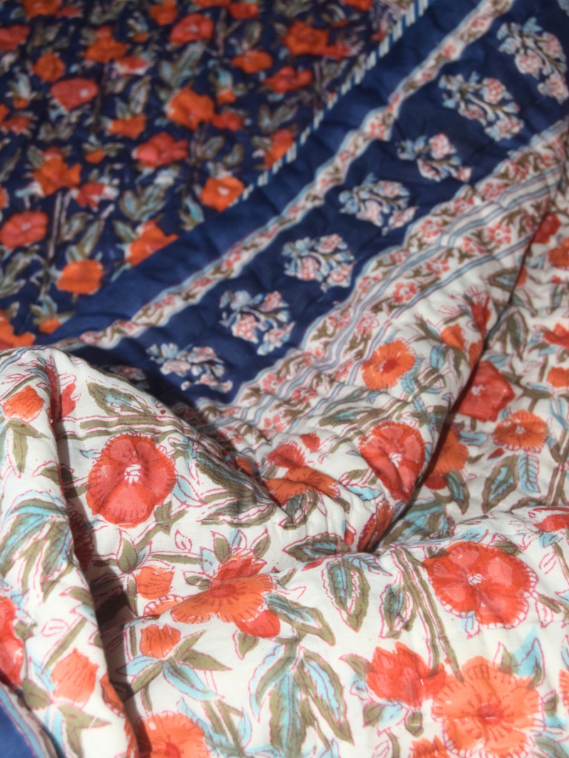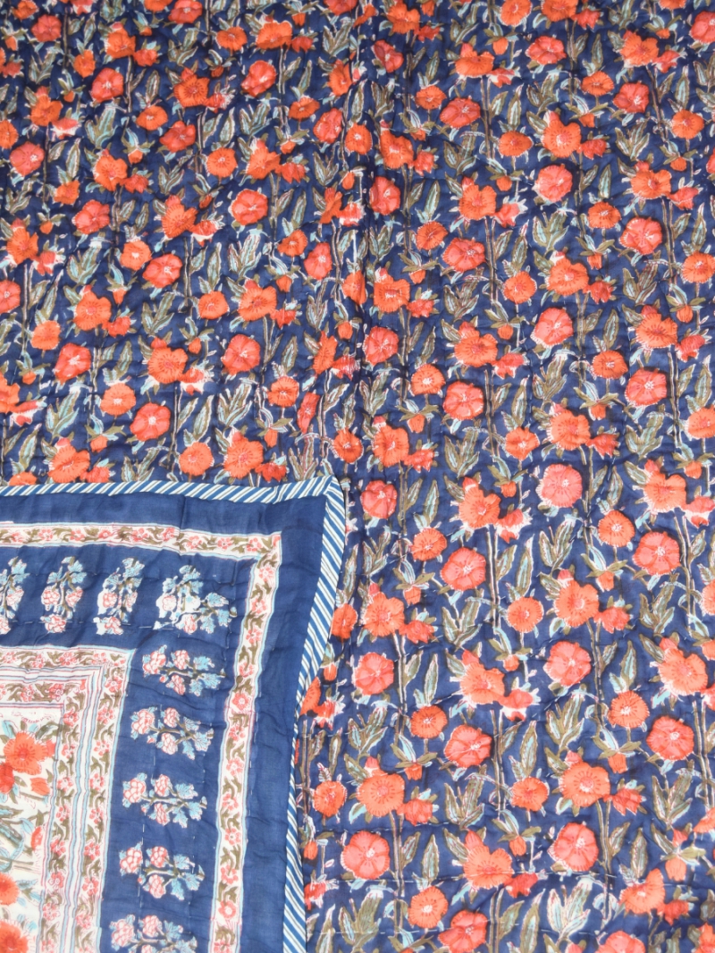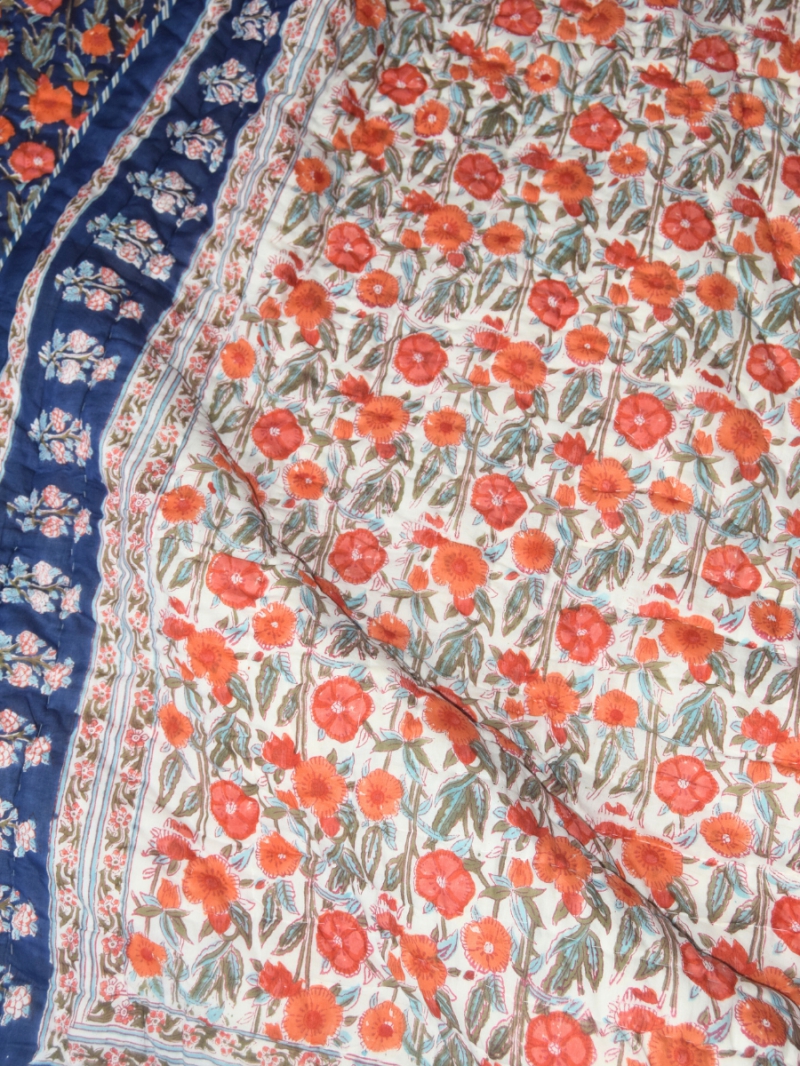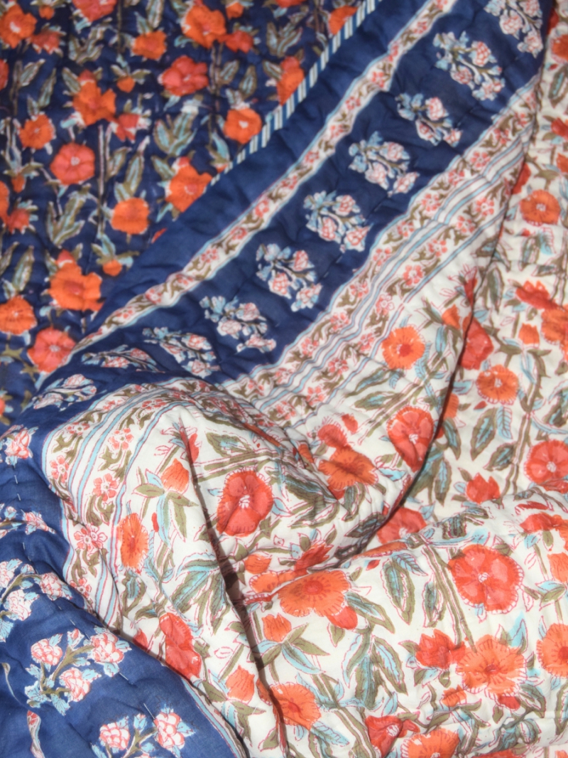 Experience the charm of Rajasthan with our beautifully handcrafted Jaipuri Print Quilt featuring stunning red, orange, and blue floral patterns. This premium cotton quilt (razai) is made using traditional hand block printing techniques of Jaipur, giving it an authentic, ethnic look while providing modern-day comfort. Lightweight yet perfectly warm, this quilt is ideal for use in summer AC rooms as well as mild winter nights.