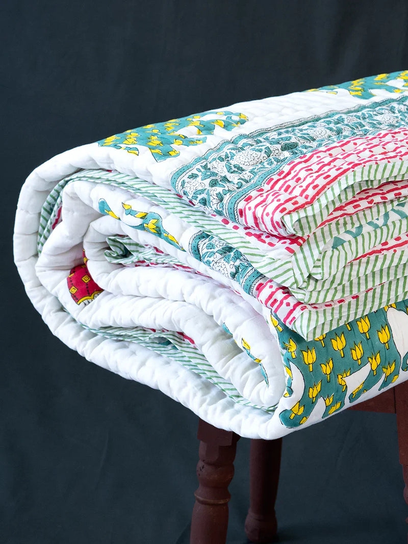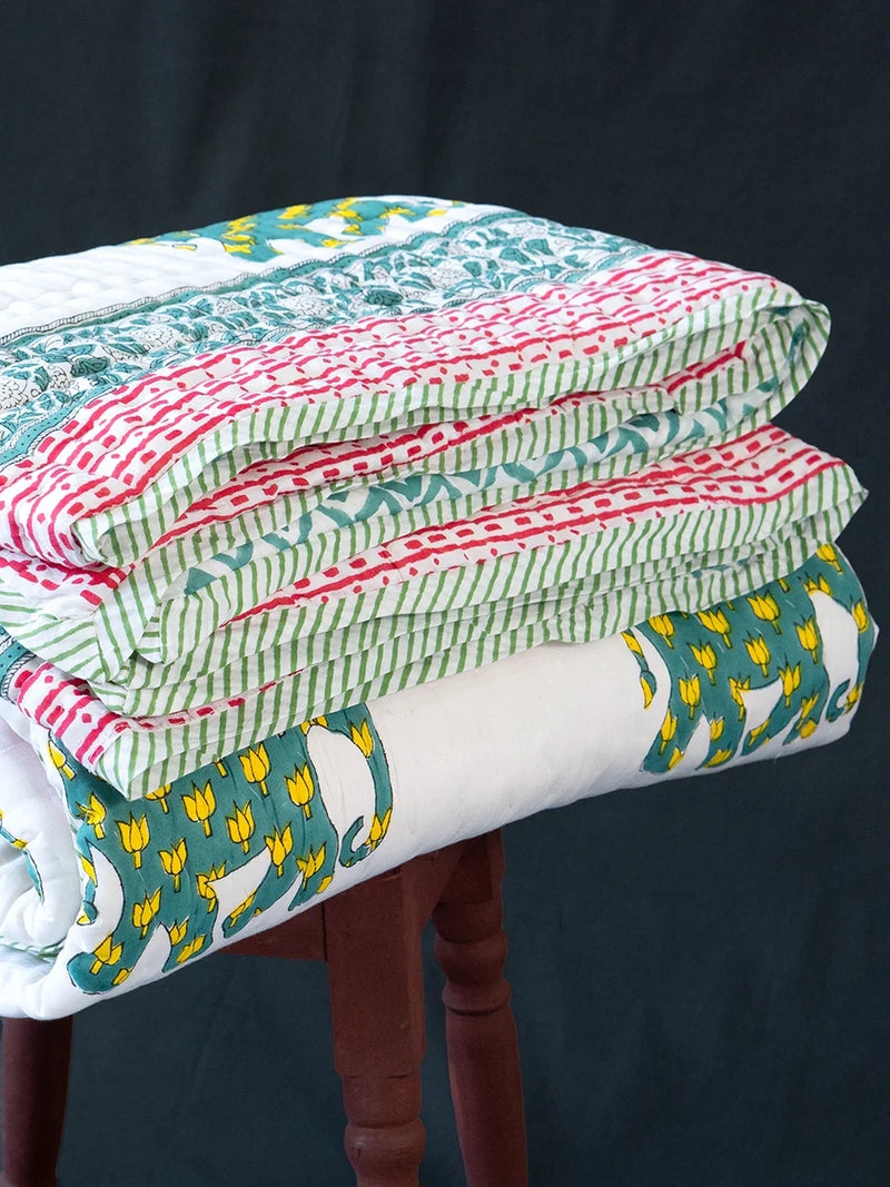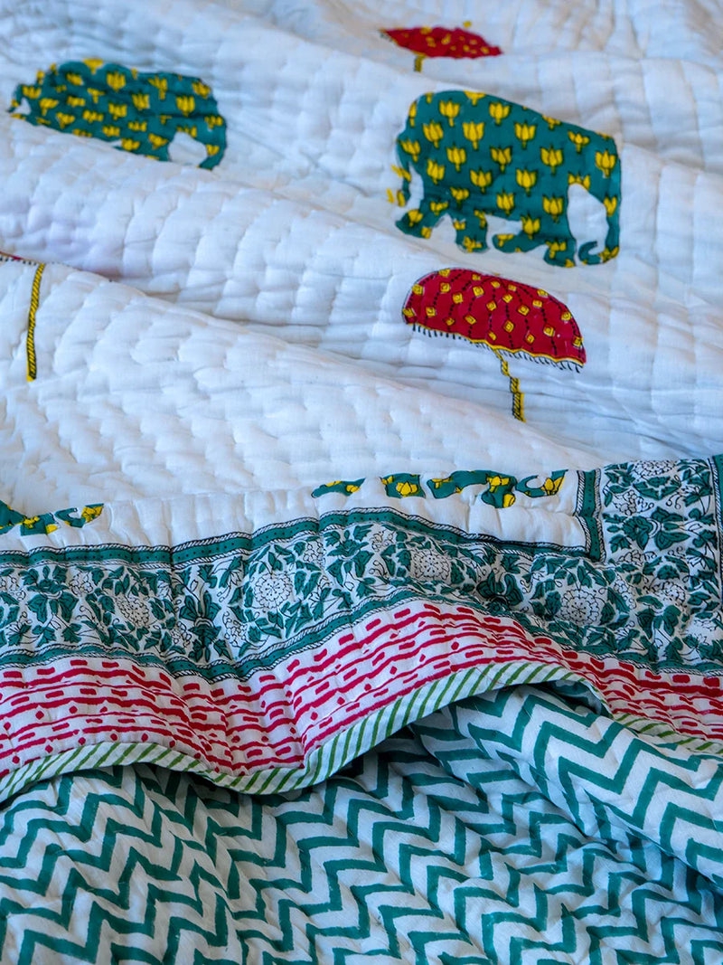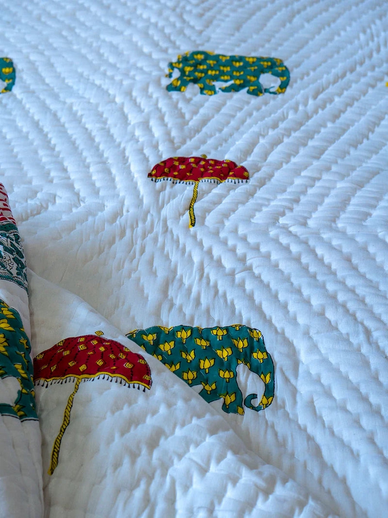 Handmade in Jaipur, India, this quilt features a charming motif of majestic elephants with umbrellas, symbolizing grace and royalty. The design is painstakingly hand block printed using traditional wooden blocks by skilled artisans, ensuring that each quilt is one of a kind.