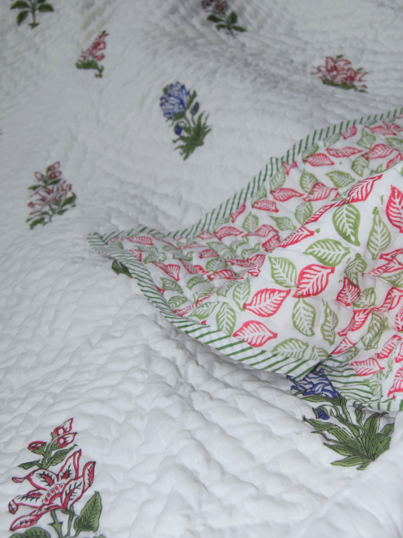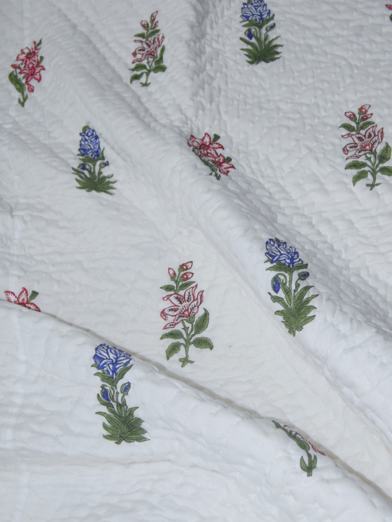 The stunning Jessamine floral design reflects grace and sophistication, inspired by nature’s beauty. Each piece is carefully handcrafted by skilled artisans in Jaipur using traditional hand block printing techniques, making every quilt unique and rich in heritage value.
