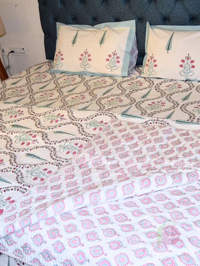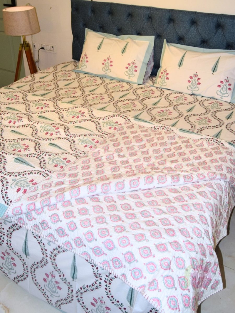 Buy Lotus Flower Bedding Set – Hand Block Print Quilted King Size Cotton Bed Cover – Jaipuri Print
