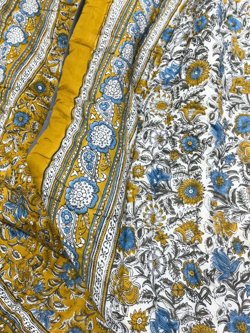 The Mimosa Flower Jaipuri Quilt is reversible, featuring two coordinated block-printed designs. One side highlights delicate mimosa blooms, while the other reveals a subtle geometric or leafy pattern — giving you two stylish looks in one premium quilt.