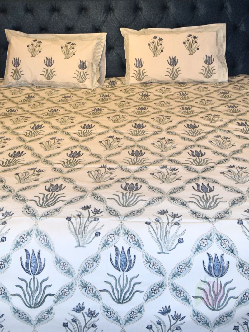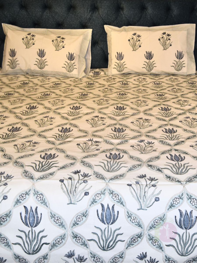 Experience timeless Rajasthani elegance with our Blue Flower Forest Hand Block Printed Cotton Bedsheet. Handmade by master artisans in Jaipur, this bedsheet brings the calming beauty of nature straight into your home with premium-quality 100% cotton fabric, natural dyes, and intricate blue floral designs.
