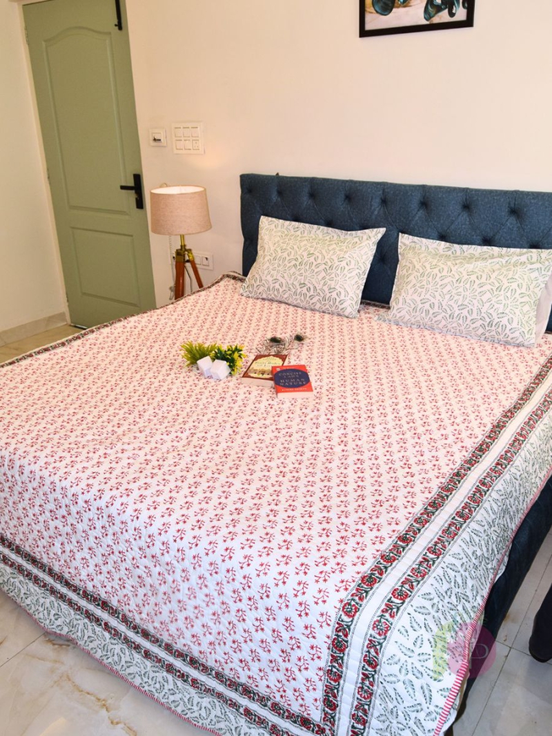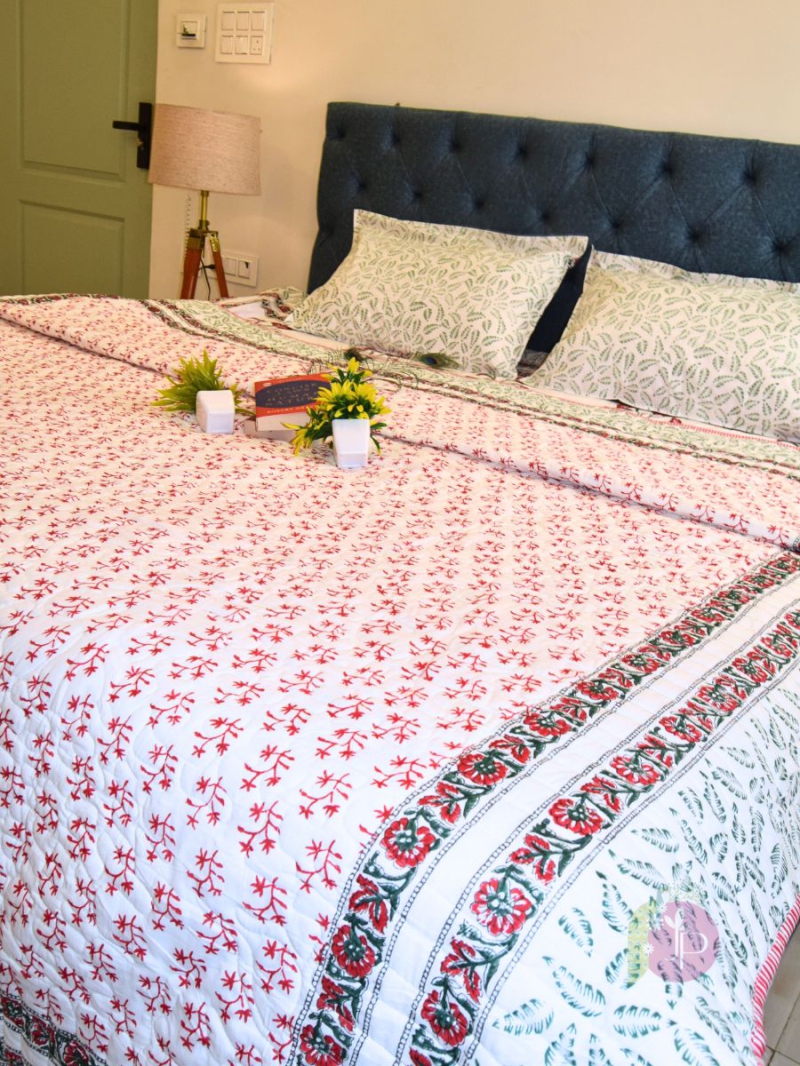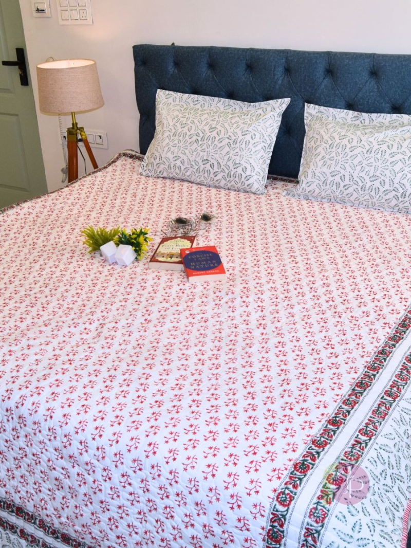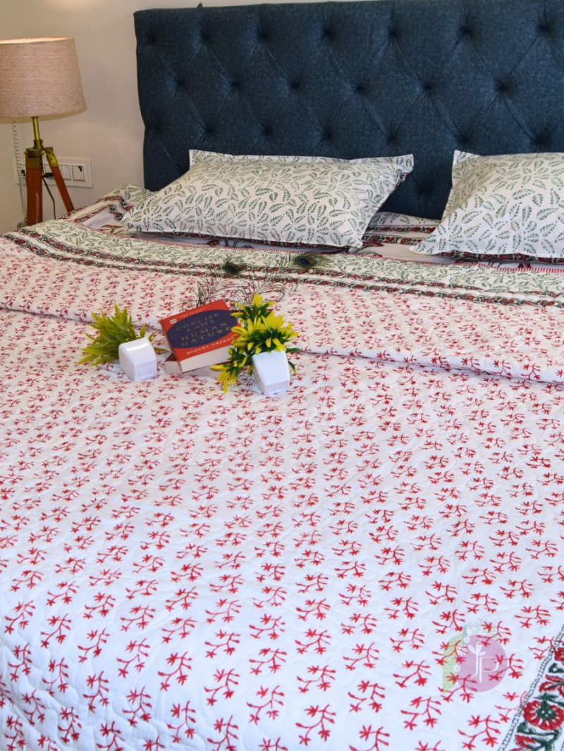 Every bed cover is block-printed manually using carved wooden blocks dipped in natural dyes—ensuring eco-conscious production and intricate detailing. The red leaf print symbolizes growth, positivity, and natural harmony. Whether you're in Delhi, Mumbai, Bengaluru, London, or New York, this quilt adds Indian heritage to any interior style—be it minimalist, rustic, or modern luxury.