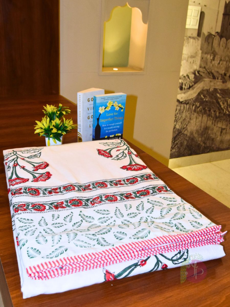 The Red Rose Jaipuri Print Cotton Dohar isn’t just a blanket—it’s a work of art. Crafted in the heart of Jaipur, this dohar reflects the city's centuries-old tradition of block printing. Each rose motif is stamped individually by hand using precision-carved wooden blocks and eco-friendly pigments. The result is a one-of-a-kind textile masterpiece that delivers both visual delight and comfort.