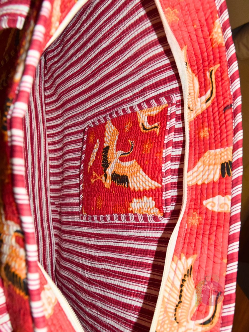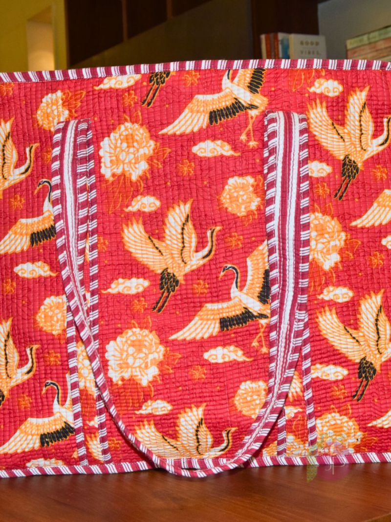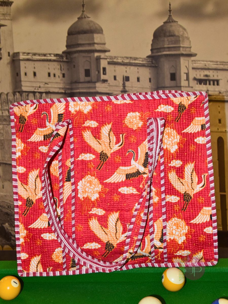 The striking red base is adorned with hand-printed motifs of majestic peacocks and delicate flowers, reflecting the rich heritage of Jaipuri block printing. Spacious, durable, and eco-conscious – it's perfect for everyday use or gifting.