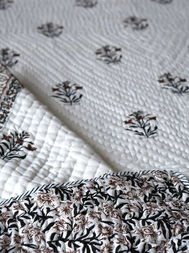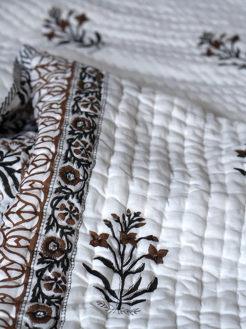 Handcrafted in Jaipur, India, this quilt features hand block printed patterns in natural umber hues, echoing the richness of the earth. Each piece is printed by skilled artisans using eco-conscious dyes and traditional wooden blocks, making every quilt a unique work of art.