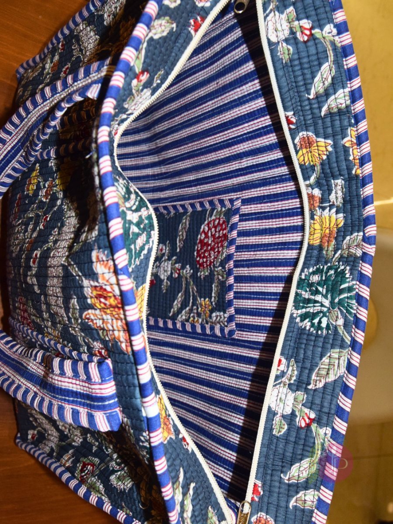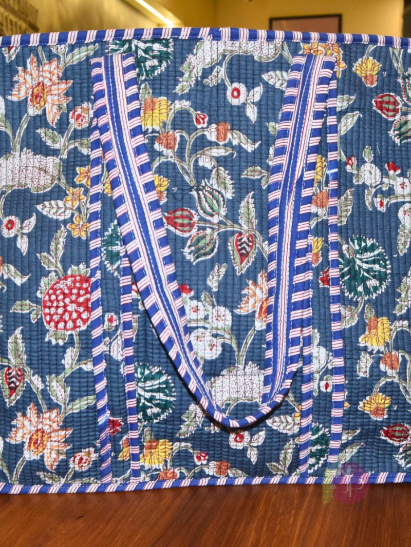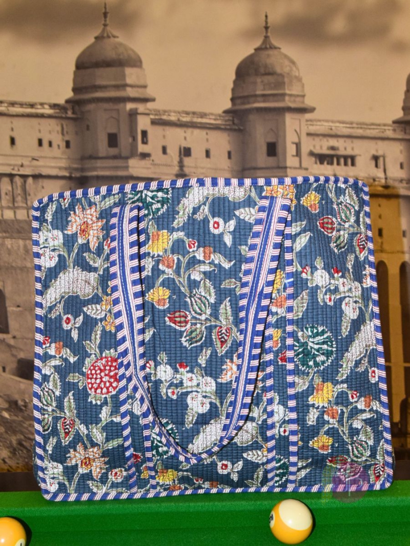 Brighten your everyday look with our Blue Tote Bag with Yellow Flower Jaipuri Print. Handcrafted in Jaipur using traditional block printing techniques, this tote combines bold colors with timeless Rajasthani artistry.