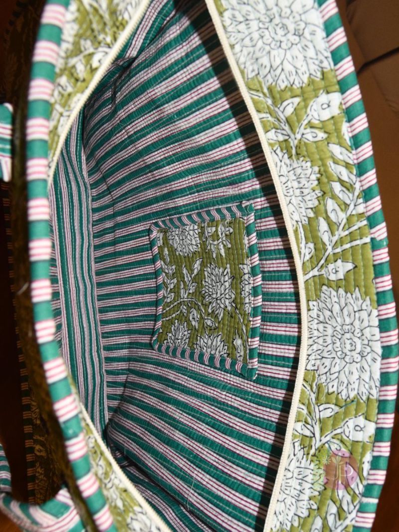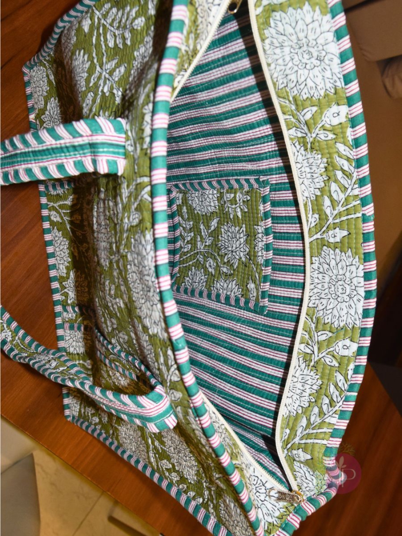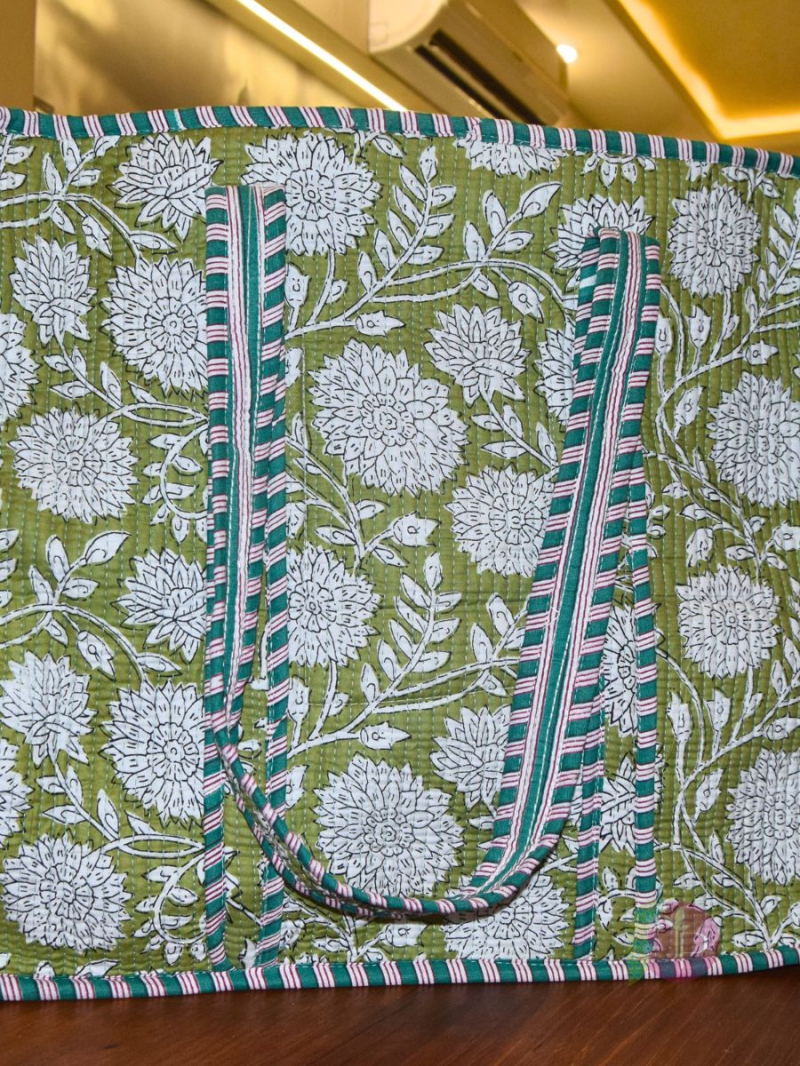 Our Henna Green Floral Tote Bag is a celebration of nature and craft. The earthy green shade, inspired by henna leaves, is enhanced with soft floral block prints in warm tones.