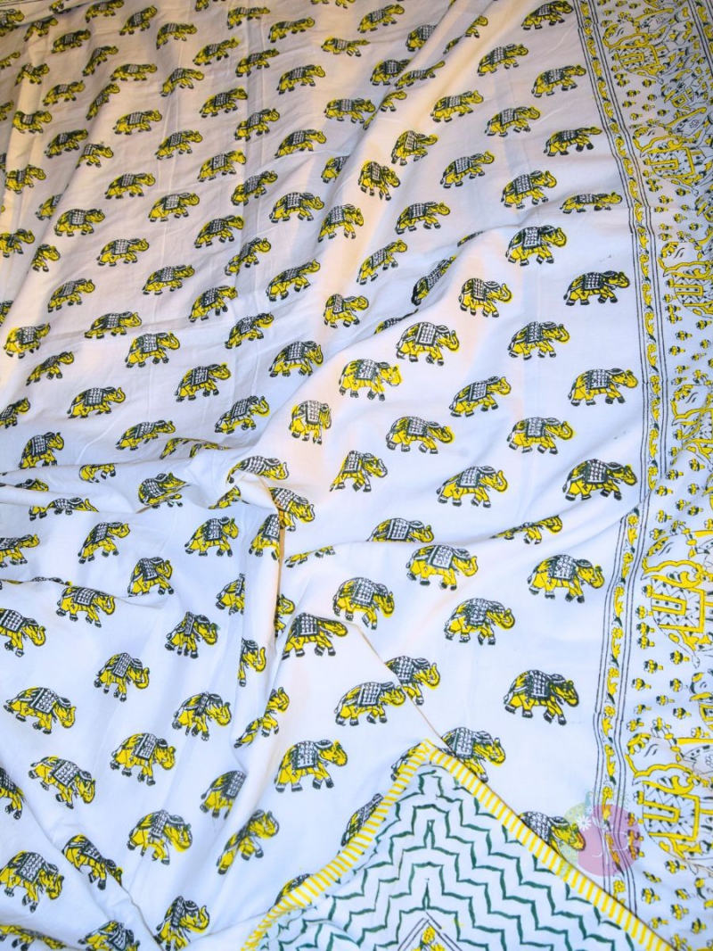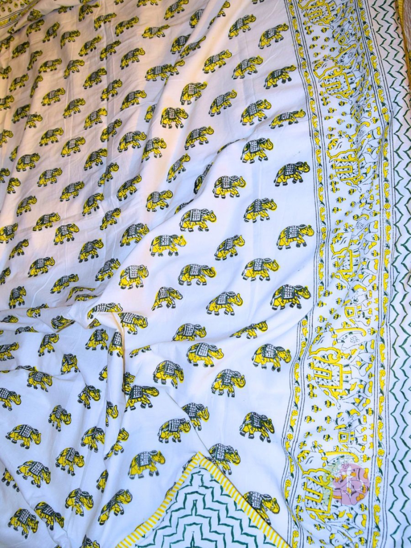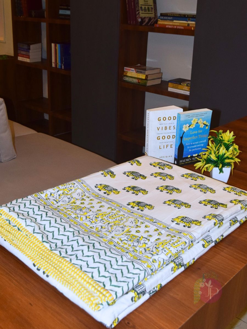 Buy Small Elephant Design Yellow & Green Hand Block Jaipuri Cotton Dohar AC Blanket