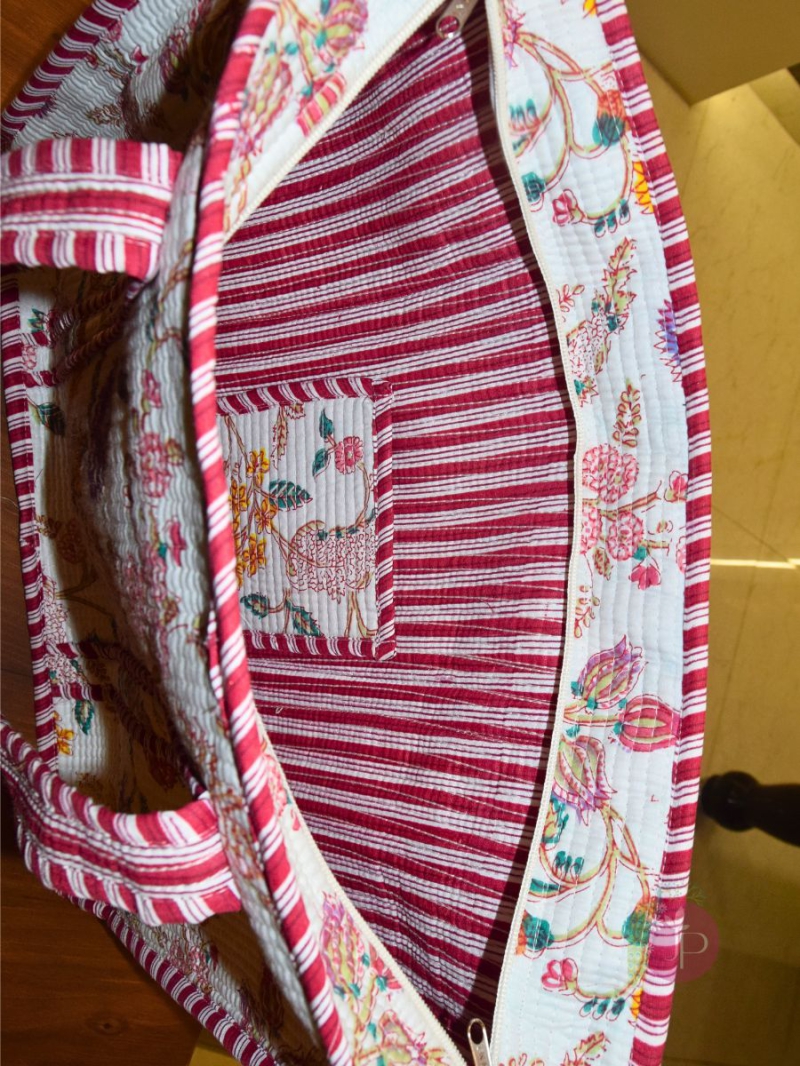 This bag is handcrafted by local artisans from Jaipur, supporting traditional block printing heritage.