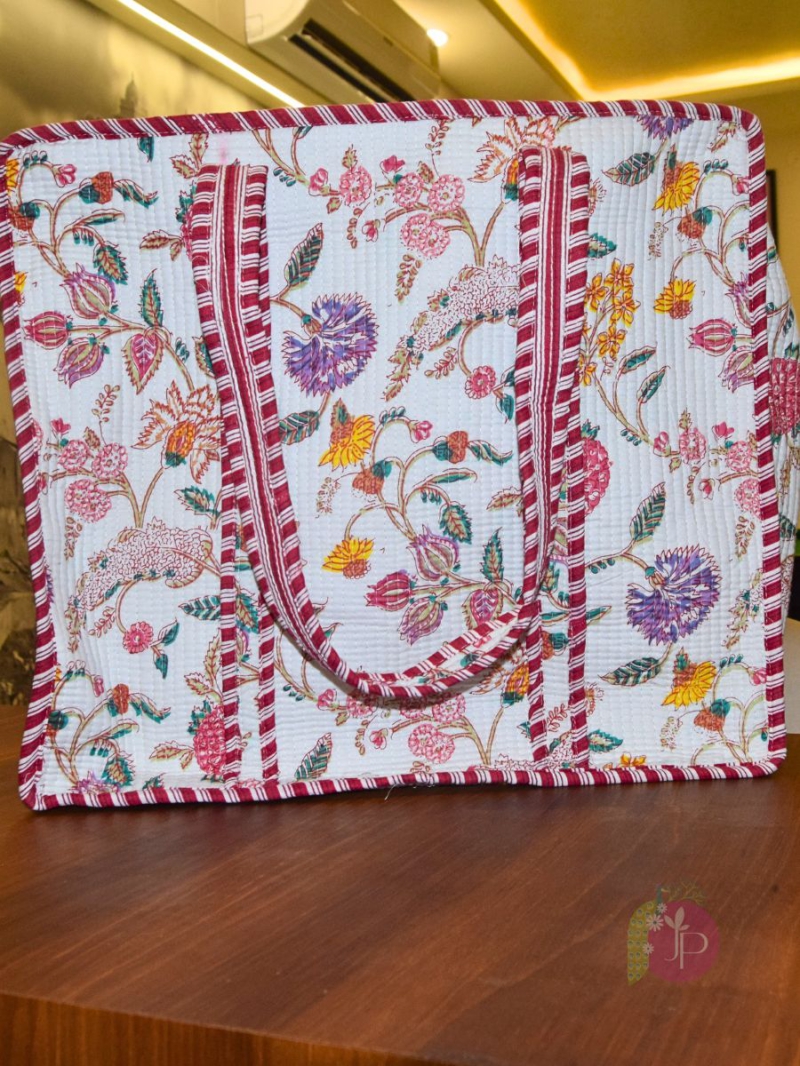 Add grace to your look with this White-Pink Lotus Flower Tote Bag featuring authentic Jaipuri block print. Spacious, durable, and elegantly handcrafted in Jaipur – perfect for everyday style.
