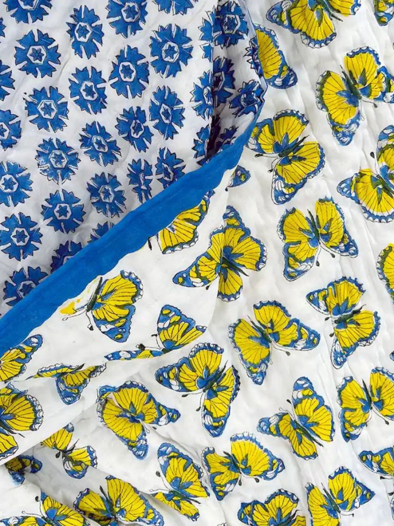 Bring color and culture to your bedroom with our Yellow Butterfly Quilt, exclusively from Jaipuri Print. This all-season comforter is made from 100% pure cotton – inside and out – and filled with soft cotton batting for breathable warmth. Hand block printed by artisans in Jaipur, this design features delicate yellow butterflies fluttering across a white backdrop.